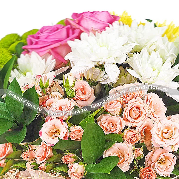 Утонченный букет состоит из двух видов роз – кустовых и обычных, а также из микса хризантем, которые придают композиции особую выразительность. С помощью изысканного букета Вы сможете выразить всю гамму любовных чувств к девушке.